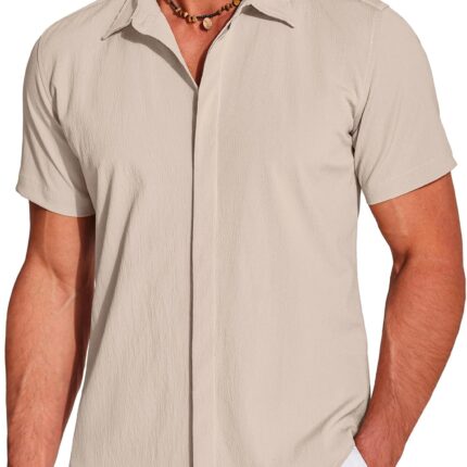 Men’s Casual Button Down Shirts Short Sleeve Textured Summer Beach Shirt with Pocket