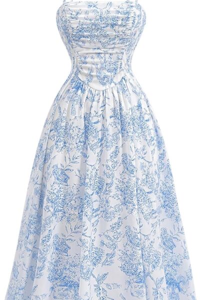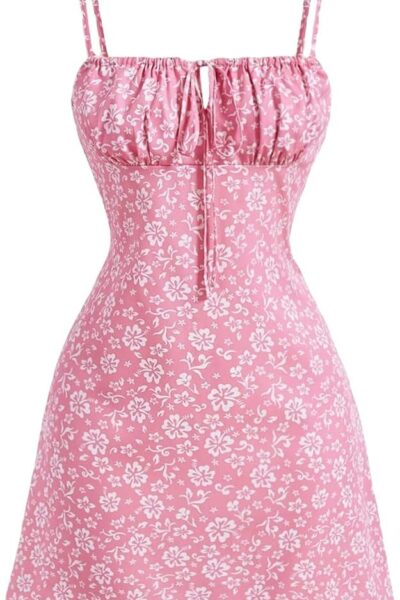 Women’s Floral Print High Waist A Line Cami Dress Shirred Spaghetti Strap Summer Midi Dress