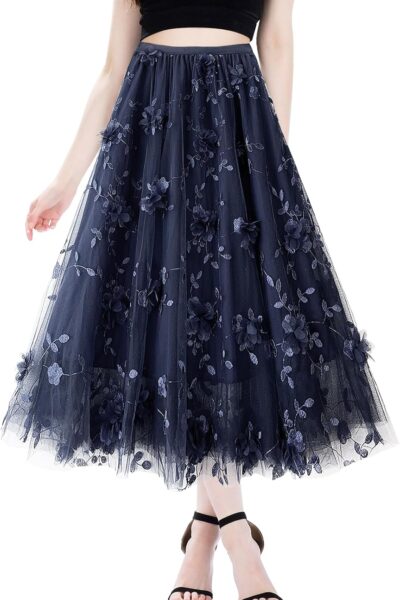 Women’s A Line Tulle Midi Skirt Tutu Tiered Petticoat Skirts Tea-Length Elastic Waist Tutu Skirts