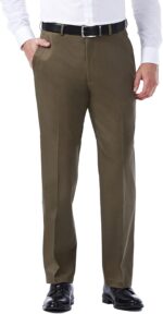 - PREMIUM NO IRON KHAKI: Eliminate the need to iron with the premium khaki pant from . Featuring a hidden expandable waistband that stretches up to 3″, off seam front pockets, single welt back pockets in a flat front, classic fit silhouette.