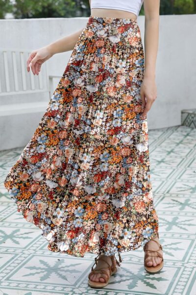 Women’s Chiffon Elastic High Waist Tiered Pleated Floral Printed A-Line Boho Long Maxi Skirts