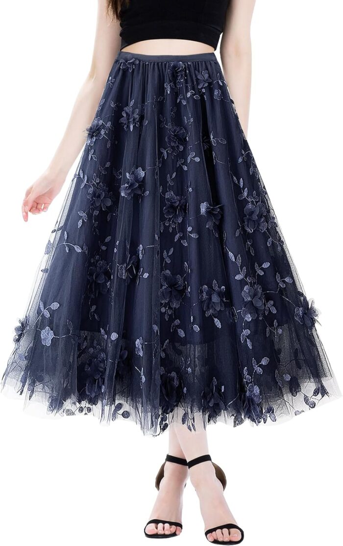 - Double-layered mesh midi skirt: one layer solid, one layer of floral lace; 3 layers are more deluxe: one layer solid, one layer of floral lace and one layer of lining. Long tulle skirt, ankle length skirt, lace pattern, high rise