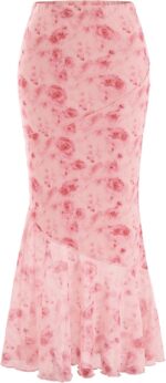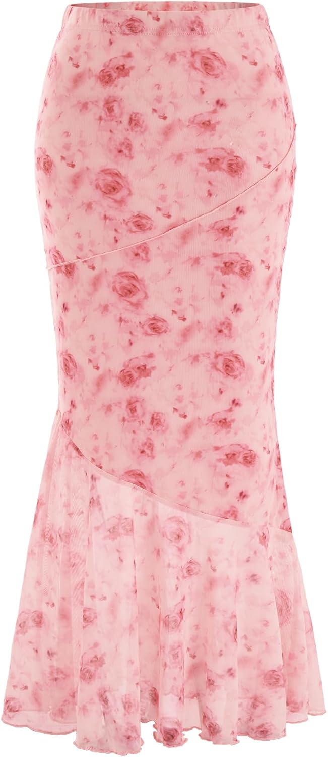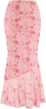 Women’s Floral Print High Waist Bodycon Ruffle Hem Fishtail Long Skirt