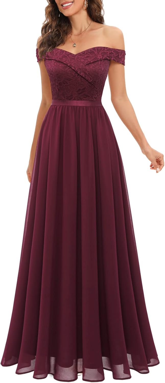 Women’s Lace Bridesmaid Dress A-Line Off Shoulder Floral Lace Chiffon Wedding Dress