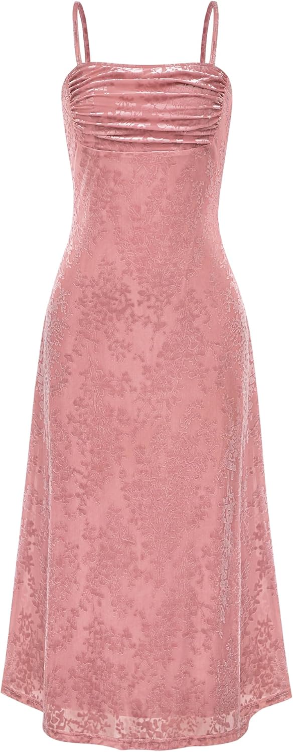 Women’s Floral Print High Waist A Line Cami Dress Shirred Spaghetti Strap Summer Midi Dress
